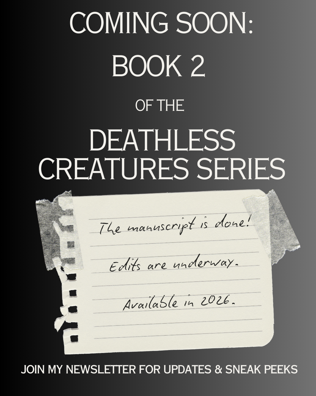 Deathless Creatures is a gritty, dark urban fantasy paranormal thriller. It combines a slow-burn gothic romance with elements of supernatural horror and lush imagery. From its compelling protagonists to a high-stakes ending, Deathless Creatures will leave you longing for the next book in this trilogy.